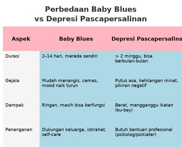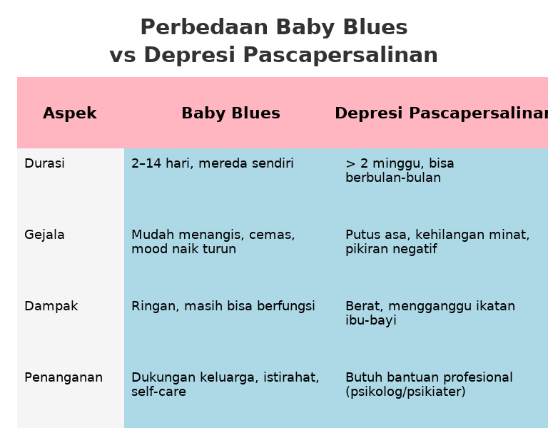 Kenali perbedaan baby blues dan depresi pascapersalinan. Pahami gejala, dampak, serta cara mengatasinya agar ibu tetap sehat jiwa dan raga.