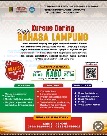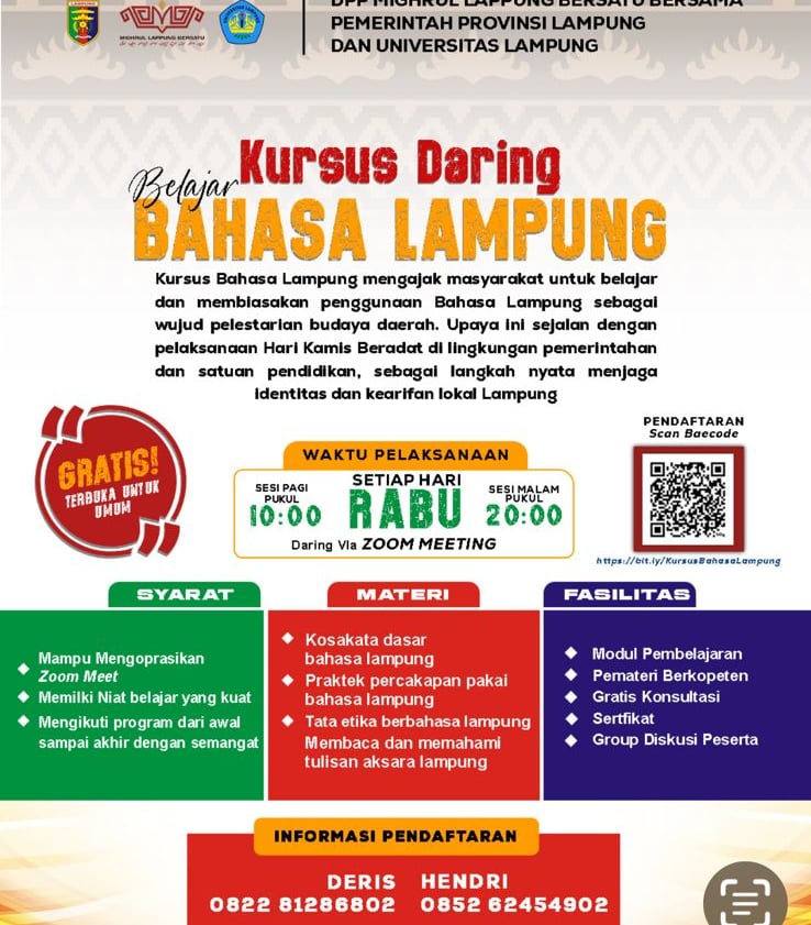 Flyer kursus daring bahasa Lampung yang diselenggarakan Mighrul Lampung Bersatu bekerja sama dengan Universitas Lampung sebagai upaya pelestarian bahasa dan budaya daerah.