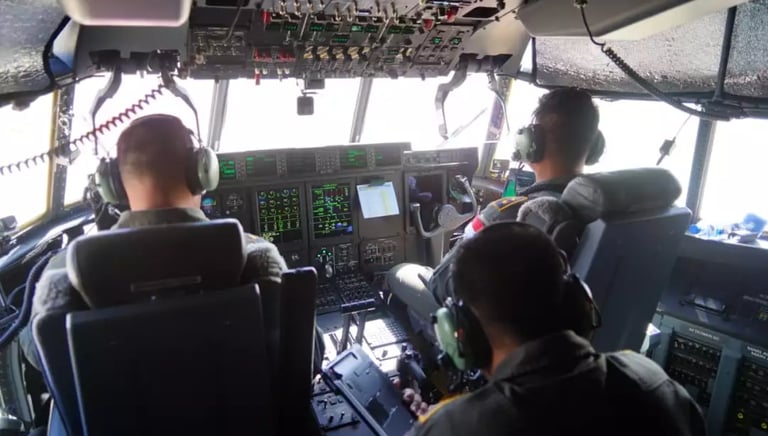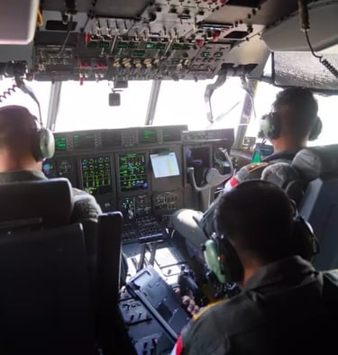 Suasana di dalam kokpit pesawat Hercules TNI AU saat misi airdrop bantuan ke Gaza. (Foto: TNI AU)