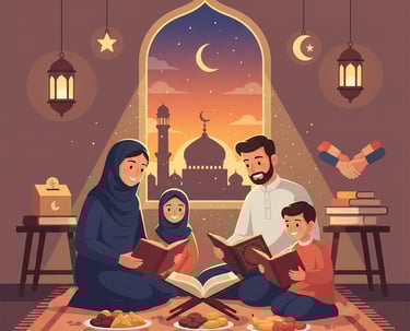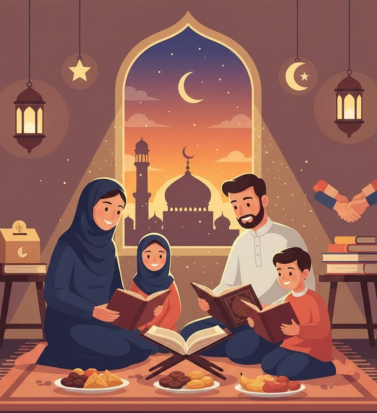 Ilustrasi kebersamaan keluarga dalam menghidupkan nilai Ramadhan melalui Al-Qur’an, pendidikan keluarga, dan kepedulian sosial.